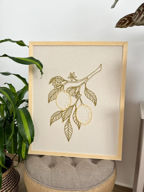 Este cuadro es mucho más que un simple adorno: es un bordado a mano con hilo de algodón sobre lienzo color crudo que transmite delicadeza y estilo. Viene enmarcado con madera Marupá de Brasil, sólida y elegante, con un marco desmontable de 20mm de ancho y 13mm de espesor.
