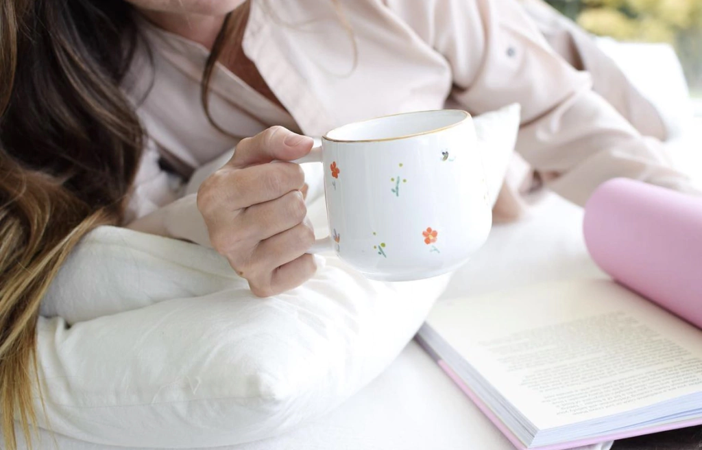 Taza en esmalte blanco, dibujos de ojos y pinceladas lilas y celestes. Detalles en oro.