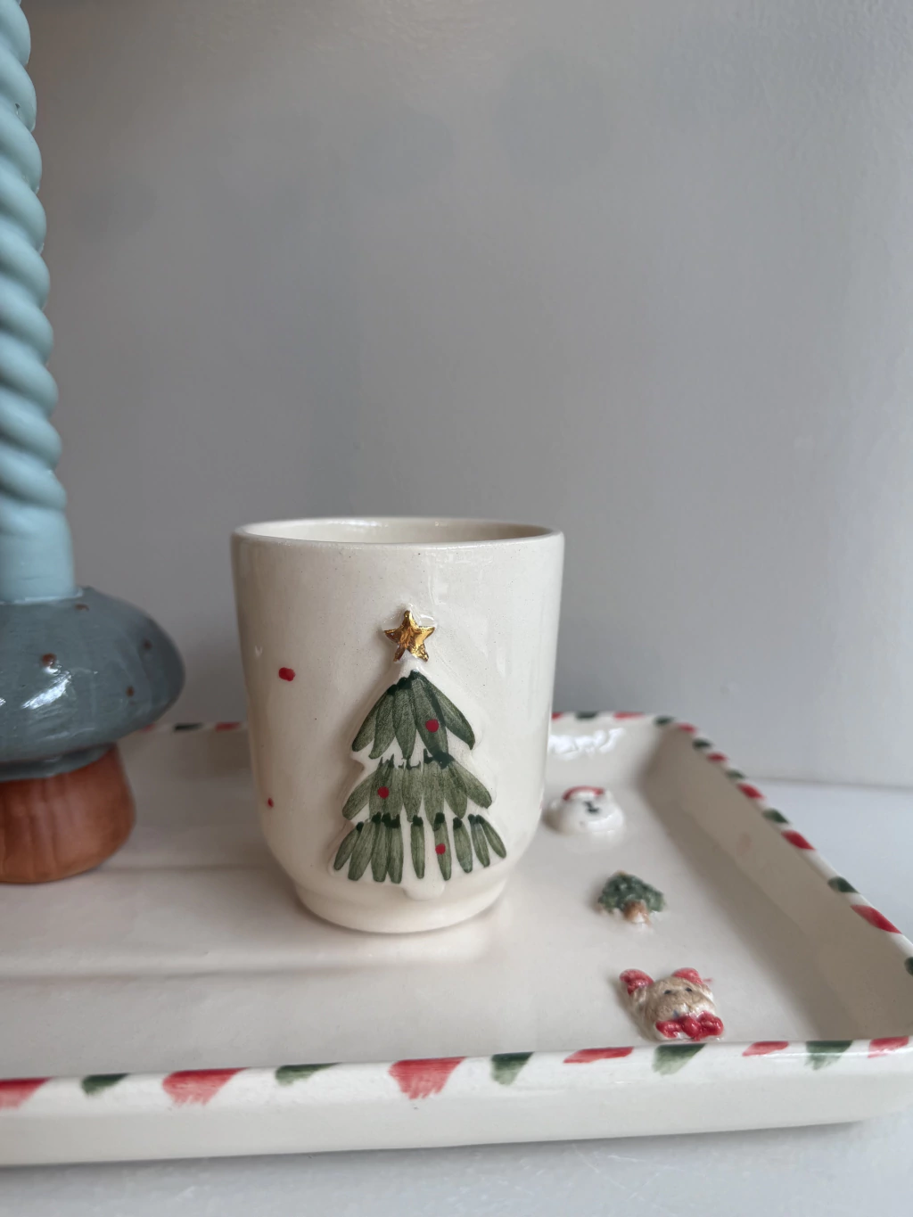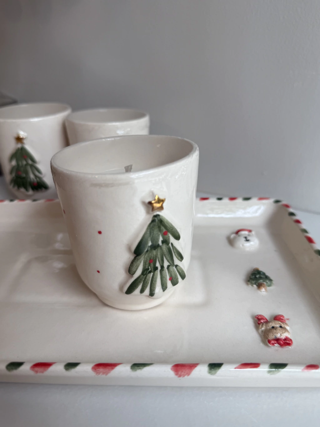 VELA en Vasito de cerámica con diseño de pino de Navidad en relieve con estrella en oro.